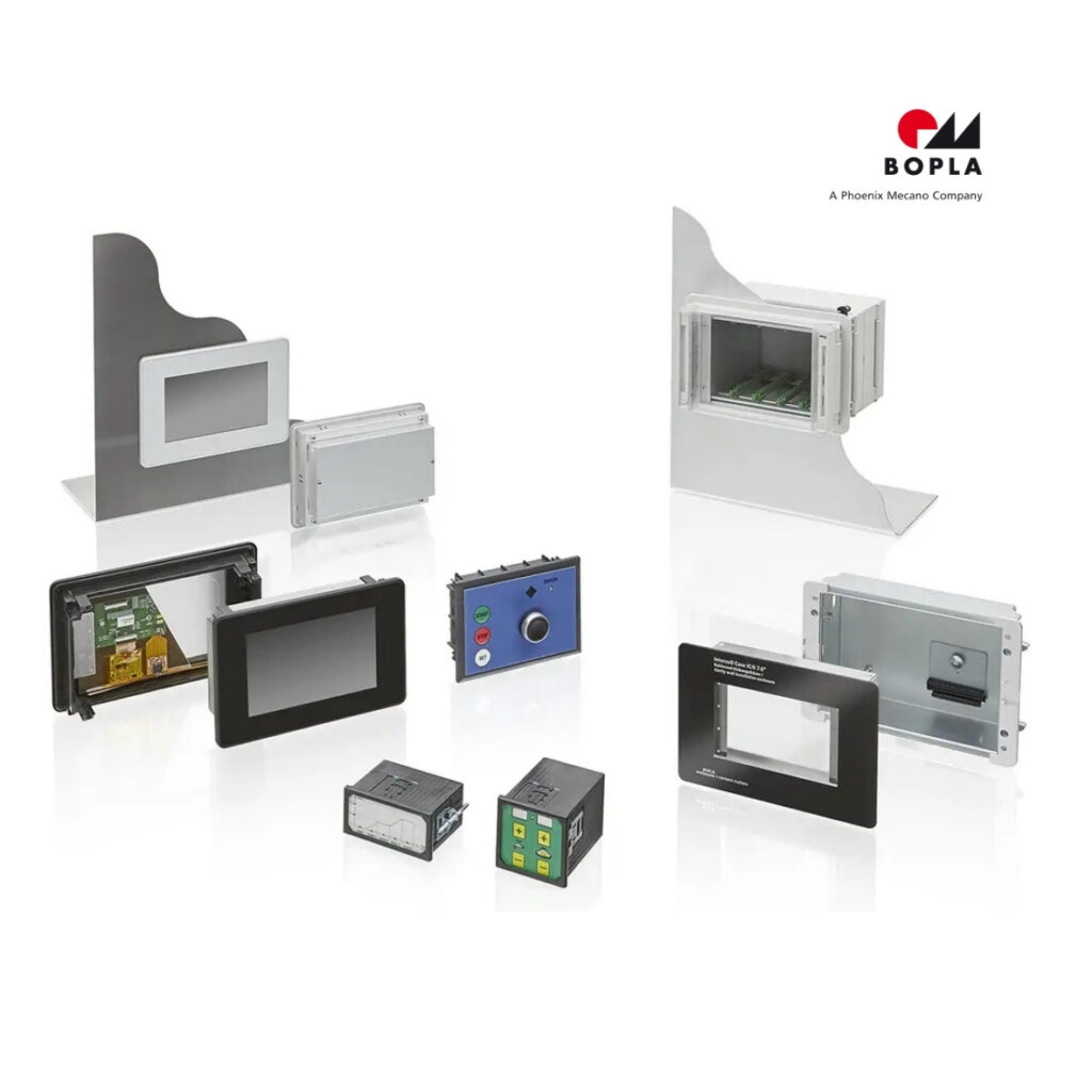 Obudowy do montażu w panelu BOPLA do zabudowy w drzwiach szafy, pulpicie i płycie czołowej. Rozwiązanie pod HMI i elektronikę, z możliwością uszczelnienia oraz obróbki pod złącza.